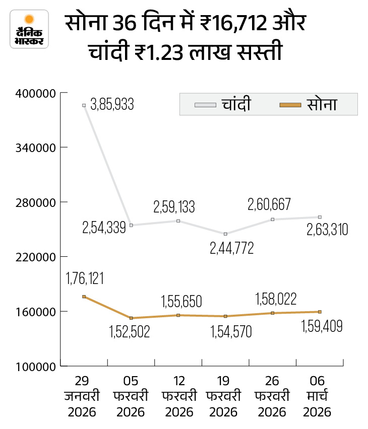 वहीं चांदी के कीमत 31 दिसंबर 2026 को 2.30 लाख रुपए थी, जो 29 जनवरी को 3.86 लाख रुपए के ऑल टाइम हाई पर पहुंच गई थी। तब से अब तक 36 दिन में चांदी 1.23 लाख रुपए सस्ती हो गई है।