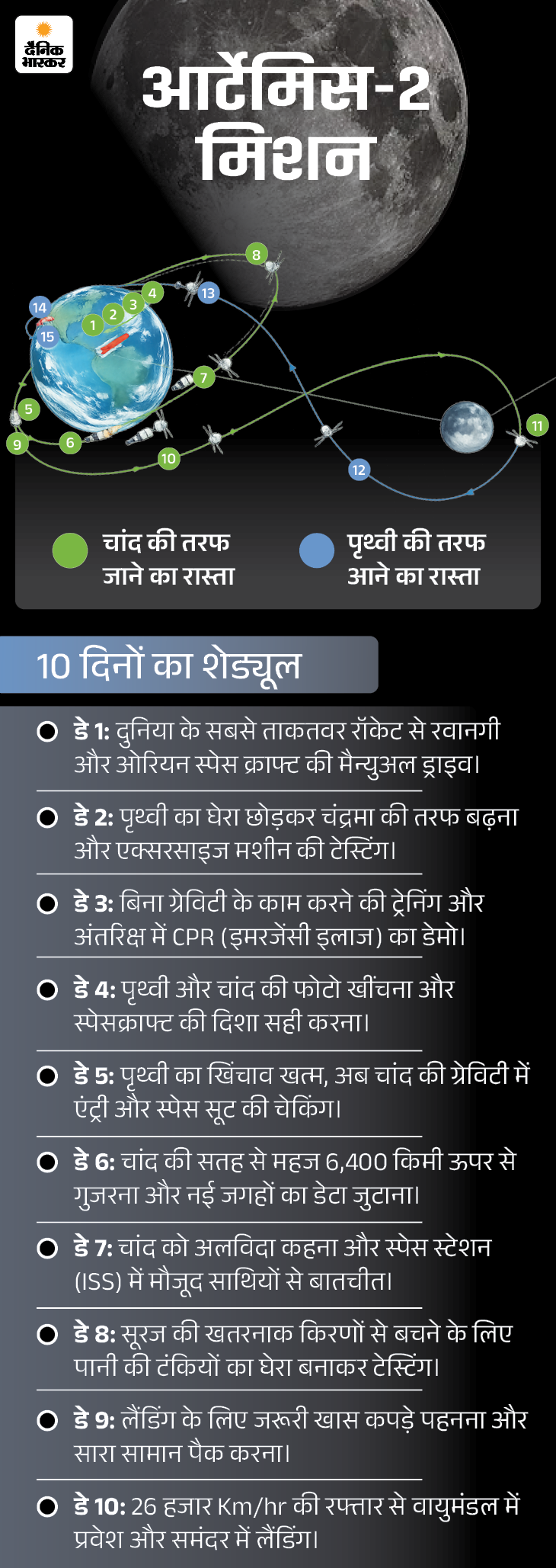 साल 1972 में ‘अपोलो-17’ के बाद यह पहला मौका है जब कोई इंसान पृथ्वी की निचली कक्षा (LEO) को पार कर चांद के करीब पहुंचेगा। चारों यात्री स्पेसक्राफ्ट से चांद के चारों ओर चक्कर लगाएंगे और फिर धरती पर लौटेंगे। यह मिशन 10 दिन का है।