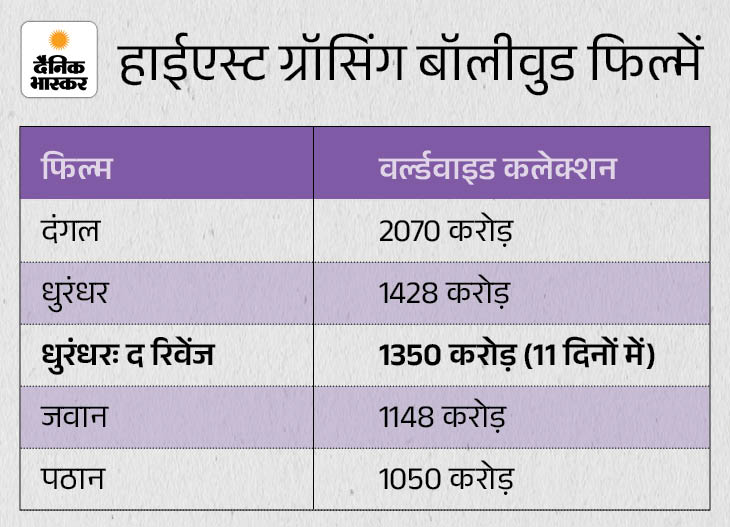 यह फिल्म पिछले पार्ट धुरंधर के 1428 करोड़ के ऑल टाइम कलेक्शन को पार करने के करीब है, जो बॉलीवुड की दूसरी हाईएस्ट ग्रॉसिंग फिल्म है। फिलहाल आमिर खान की दंगल पहले नंबर पर है।
