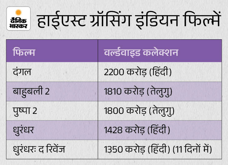 बॉलीवुड की दूसरी सबसे ज्यादा कमाई करने वाली फिल्म धुरंधरः द रिवेंज, सभी भाषाओं में भारत की 5वीं सबसे ज्यादा कमाई करने वाली फिल्म है। यह आरआरआर और केजीएफ चैप्टर 2 का रिकॉर्ड तोड़ चुकी है, लेकिन अब भी पुष्पा-2 और बाहुबली 2 से पीछे है।