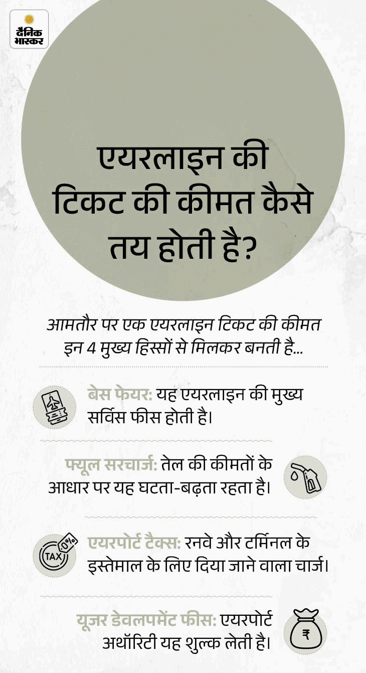 एअर इंडिया ने 12 मार्च से घरेलू फ्लाइट टिकटों पर 399 रुपए का फ्यूल सरचार्ज लगा रही है। वहीं, इंटरनेशनल फ्लाइट्स के किराए में करीब 15% की बढ़ोतरी की है। जेट फ्यूल के दाम लगातार बढ़ने से दुनियाभर की प्रमुख एयरलाइंस ने भी टिकटों के दाम बढ़ाए हैं। कई कंपनियां अपने विमानों को ग्राउंडेड करने का प्लान भी बना रही हैं।