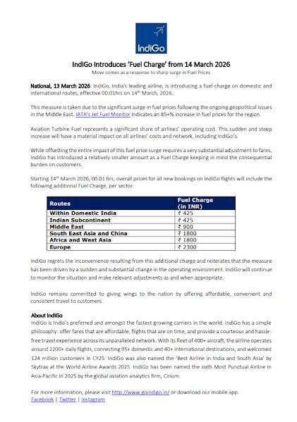 इंडिगो ने यात्रियों पर पड़ने वाले बोझ को कम रखने के लिए अलग-अलग दूरी के हिसाब से चार्ज तय किया है। कंपनी ने कहा कि जेट फ्यूल की कीमत बढ़ने से बढ़ी हुई लागत को वसूलने के लिए किराए में बहुत बड़ी बढ़ोतरी की जरूरत थी। इंडिगो ने कहा कि वह स्थिति पर नजर बनाए रखेगी और जरूरत पड़ने पर इन चार्जेस में बदलाव किया जाएगा।