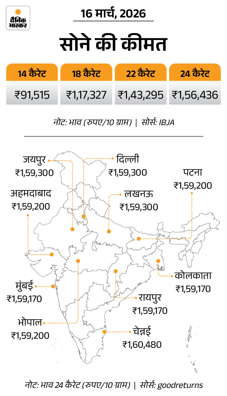 सोने-चांदी में आज लगातार दूसरे कारोबारी दिन गिरावट है। इंडिया बुलियन एंड ज्वेलर्स एसोसिएशन (IBJA) के मुताबिक 10 ग्राम 24 कैरेट सोना 1,963 रुपए गिरकर 1.56 लाख रुपए पर आ गया है। इससे पहले 13 मार्च को सोना 1.58 लाख रुपए प्रति 10g था।
