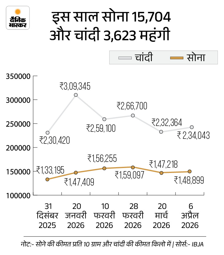इस साल सोने-चांदी की कीमत में लगातार उतार-चढ़ाव देखने को मिल रहा है। सोना 2026 में अब तक 15,704 रुपए और चांदी 3,623 रुपए महंगी हुई है। 31 दिसंबर 2025 को 10g सोना 1.33 लाख रुपए पर था, जो अब 1.48 लाख रुपए पर पहुंच गया है। वहीं चांदी 2.30 लाख रुपए किलो थी, जो अब 2.34 लाख रुपए पर पहुंच गई है।