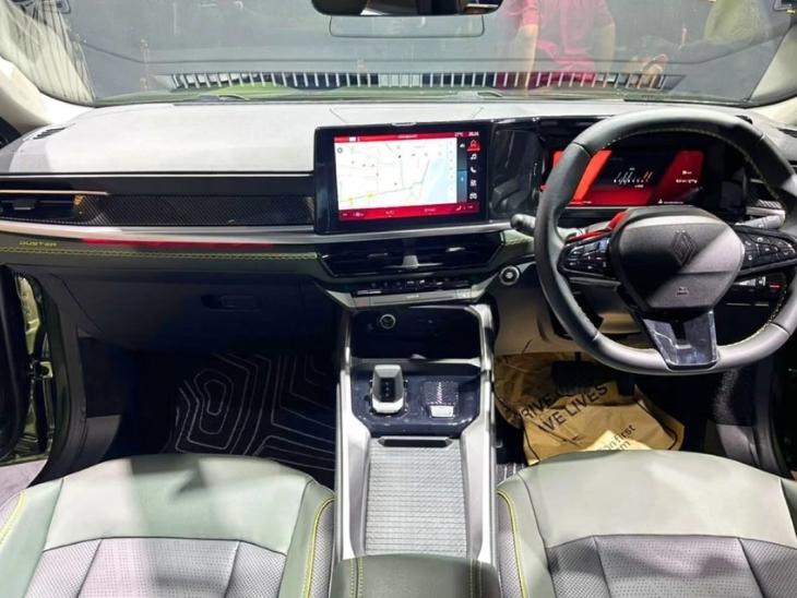 नई डस्टर में डबल-लेयर डैशबोर्ड दिया गया है, जिसमें हल्के और डार्क ब्लैक शेड्स हैं। सेंटर कंसोल ड्राइवर की ओर थोड़ा झुका हुआ है। हायर वैरिएंट में दो डिजिटल स्क्रीन मिलेंगी। इसमें ड्राइवर के लिए 7 इंच की स्क्रीन और इंफोटेनमेंट के लिए गूगल OS के साथ 10.25 इंच की टचस्क्रीन शामिल है। सेंटर AC वेंट के नीचे एक हॉरिजोंटल पैनल में कई बटन मिलते हैं, जो इंफोटेनमेंट और HVC सिस्टम को कंट्रोल करते हैं।