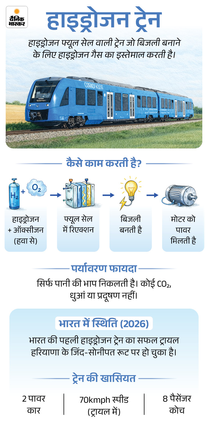 भारत अपनी पहली हाइड्रोजन ट्रेन लॉन्च करने के बेहद करीब है। रिसर्च डिजाइन एंड स्टैंडर्ड ऑर्गनाइजेशन (RDSO) ने इसका ट्रायल पूरा कर लिया है। यह दुनिया की सबसे लंबी (10 कोच) और सबसे शक्तिशाली (2400kW) हाइड्रोजन ट्रेन होगी। इसमें दो ड्राइविंग पावर कार और 8 पैसेंजर कोच होंगे। यह ट्रेन पूरी तरह से इको-फ्रेंडली होगी और धुएं के बजाय सिर्फ पानी की भाप छोड़ेगी।