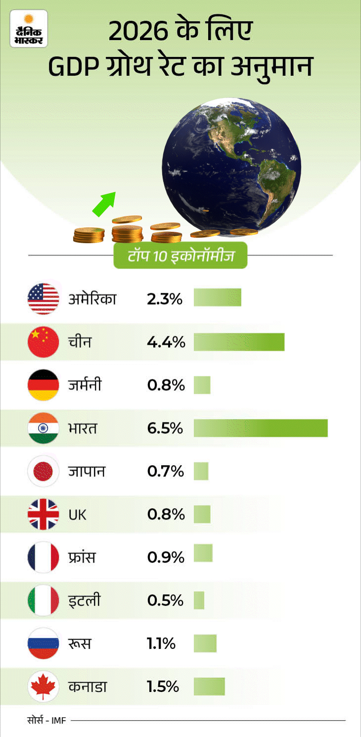 ग्लोबल लेवल पर आर्थिक स्थिति कुछ खास अच्छी नहीं रहने वाली है। IMF ने दुनिया की कुल ग्रोथ रेट का अनुमान 3.3% से घटाकर 3.1% कर दिया है। साल 2025 में ग्लोबल इकोनॉमी 3.4% की दर से बढ़ी थी, यानी अब इसमें सुस्ती आने के संकेत हैं।