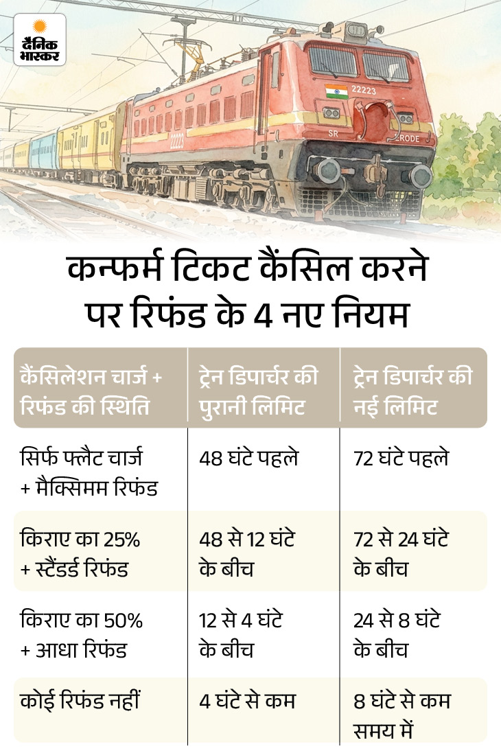 पहले यह समय 4 घंटे था, जिसे बढ़ाकर अब 8 घंटे कर दिया गया है। हालांकि, 24 से 8 घंटे के बीच टिकट कैंसिल करने पर अभी भी 50% पैसा ही वापस मिलेगा।