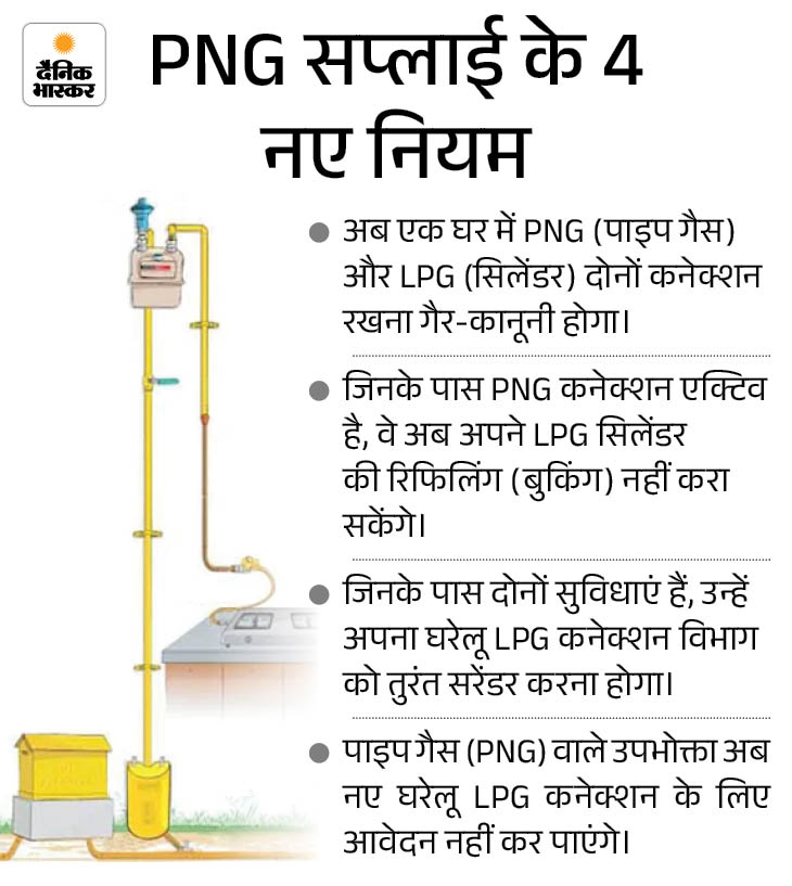 सरकार ने 14 मार्च को ही PNG कनेक्शन को लेकर नए नियम जारी किए थे। इसके तहत अगर आपके घर में पाइप्ड नेचुरल गैस (PNG) कनेक्शन है तो अब आपको अपना LPG सिलेंडर को सरेंडर करना होगा। नए आदेश के मुताबिक, PNG यूजर्स को न तो नया LPG कनेक्शन मिलेगा और न ही पुराना सिलेंडर रीफिल होगा। सरकार इससे पहले LPG सिलेंडर की सप्लाई को लेकर 4 बार नए नियम जारी कर चुकी है।
