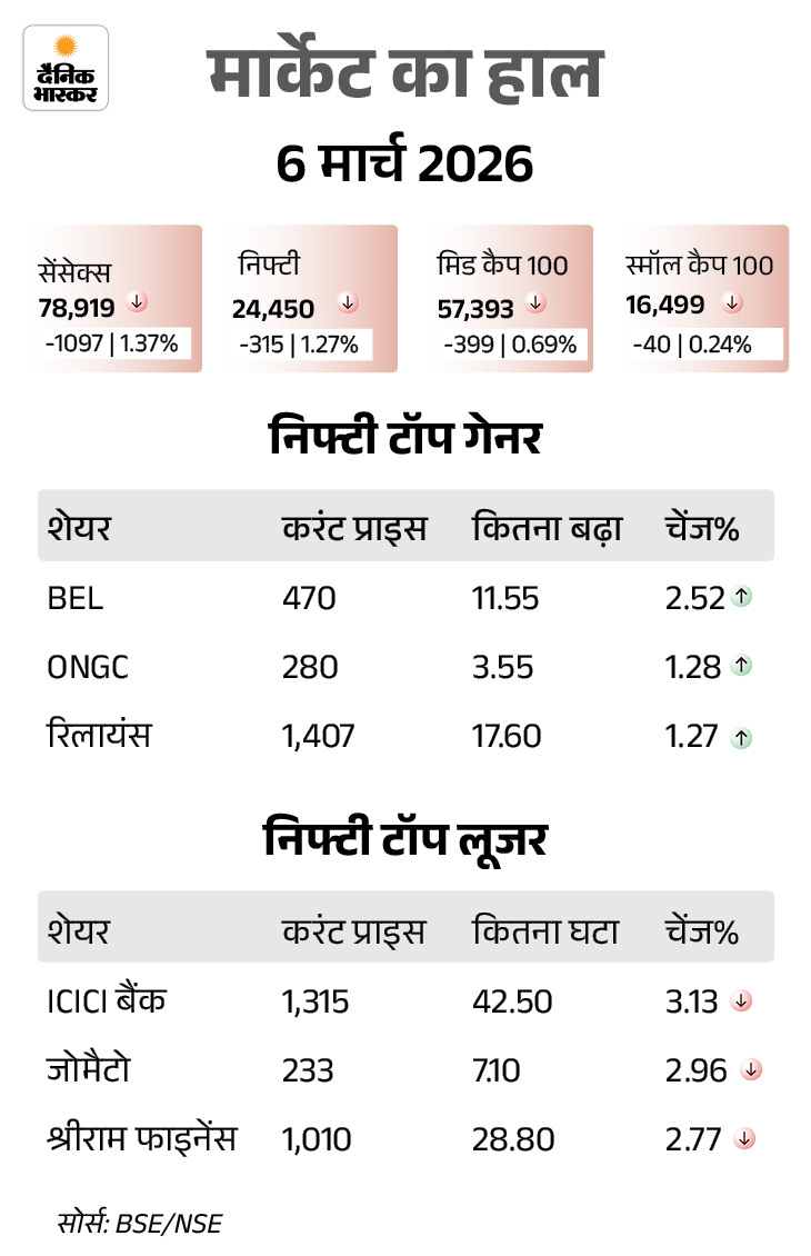 शेयर बाजार में आज यानी 6 मार्च को गिरावट रही। सेंसेक्स 1097 अंक (1.37%) गिरकर 78,919 पर बंद हुआ। निफ्टी में भी 315 अंक (1.27%) की गिरावट रही। ये 24,450 पर आ गया। आज के कारोबार में बैंक, रियल्टी और ऑटो शेयरों में सबसे ज्यादा बिकवाली रही।