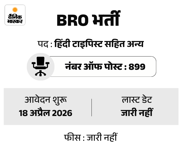 सीमा सड़क संगठन (बॉर्डर रोड ऑर्गेनाइजेशन) ने 899 पदों पर भर्ती निकाली है। इस भर्ती की शुरुआत 18 अप्रैल 2026 से होगी। उम्मीदवार ऑफलाइन आवेदन कर सकते हैं।