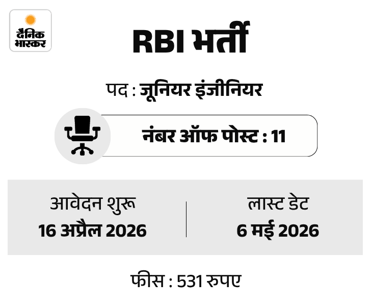 रिजर्व बैंक ऑफ इंडिया ने जूनियर इंजीनियर (सिविल/इलेक्ट्रिकल) के 11 पदों पर भर्ती निकाली है। उम्मीदवार ऑफिशियल वेबसाइट opportunities.rbi.org.in पर जाकर आवेदन कर सकते हैं। यह भर्ती फुल टाइम कॉन्ट्रेक्ट बेसिस पर की जाएगी। इस भर्ती के लिए परीक्षा का आयोजन 6 जून को किया जाएगा।