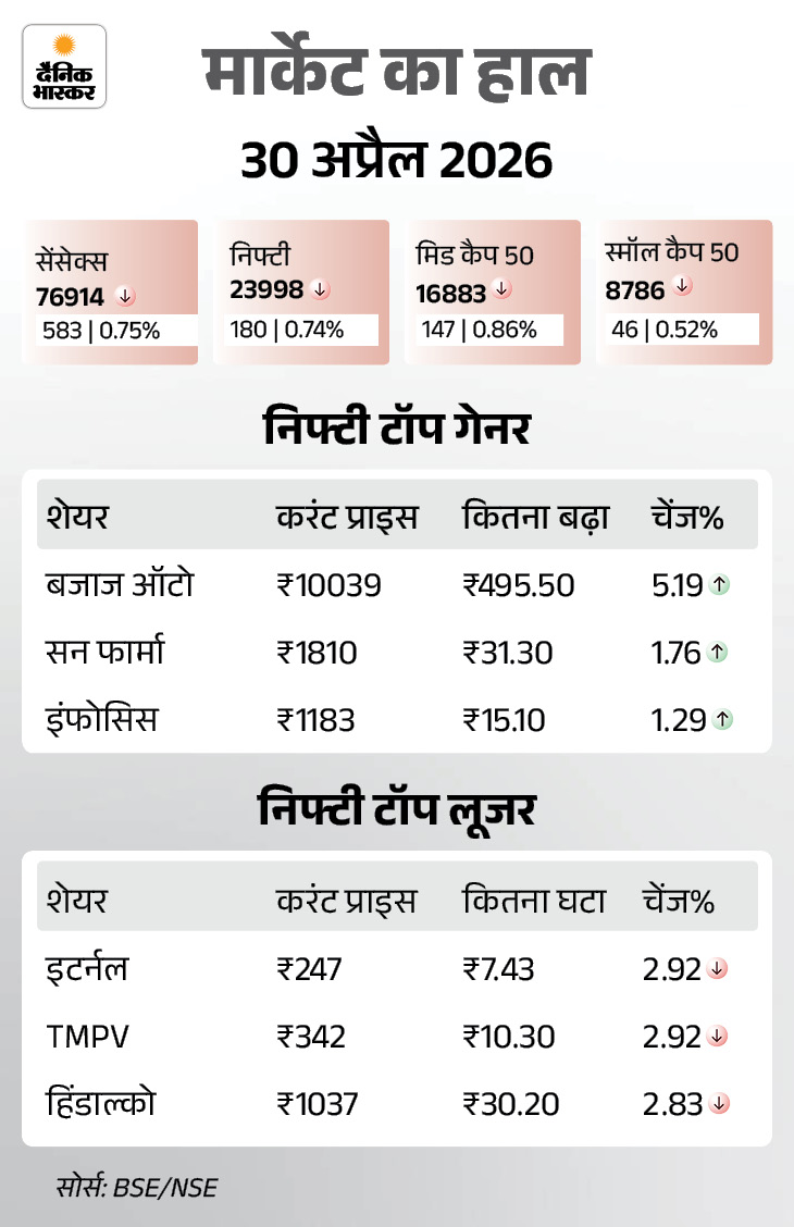 सेंसेक्स में आज यानी गुरुवार, 30 अप्रैल को 583 अंक (0.75%) की गिरावट रही। ये 76,913 के स्तर पर बंद हुआ। निफ्टी में भी 180 अंकों (0.74%) की गिरावट रही, ये 23,998 के स्तर पर आ गया है। आज के कारोबार में आईटी में सबसे ज्यादा खरीदारी रही, जबकि मेटल और सरकारी बैंक के शेयरों में सबसे ज्यादा बिकवाली।