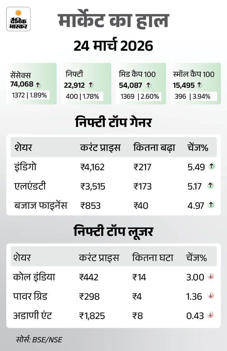 शेयर बाजार में आज यानी 24 मार्च को तेजी रही। सेंसेक्स 1372 अंक (1.89%) की तेजी के साथ 74,068 पर कारोबार कर रहा है। वहीं निफ्टी में भी 400 अंक (1.78%) की तेजी है, ये 22,912 पर पहुंच गया। आज बैंकिंग और ऑटो शेयर्स में सबसे ज्यादा खरीदारी रही।