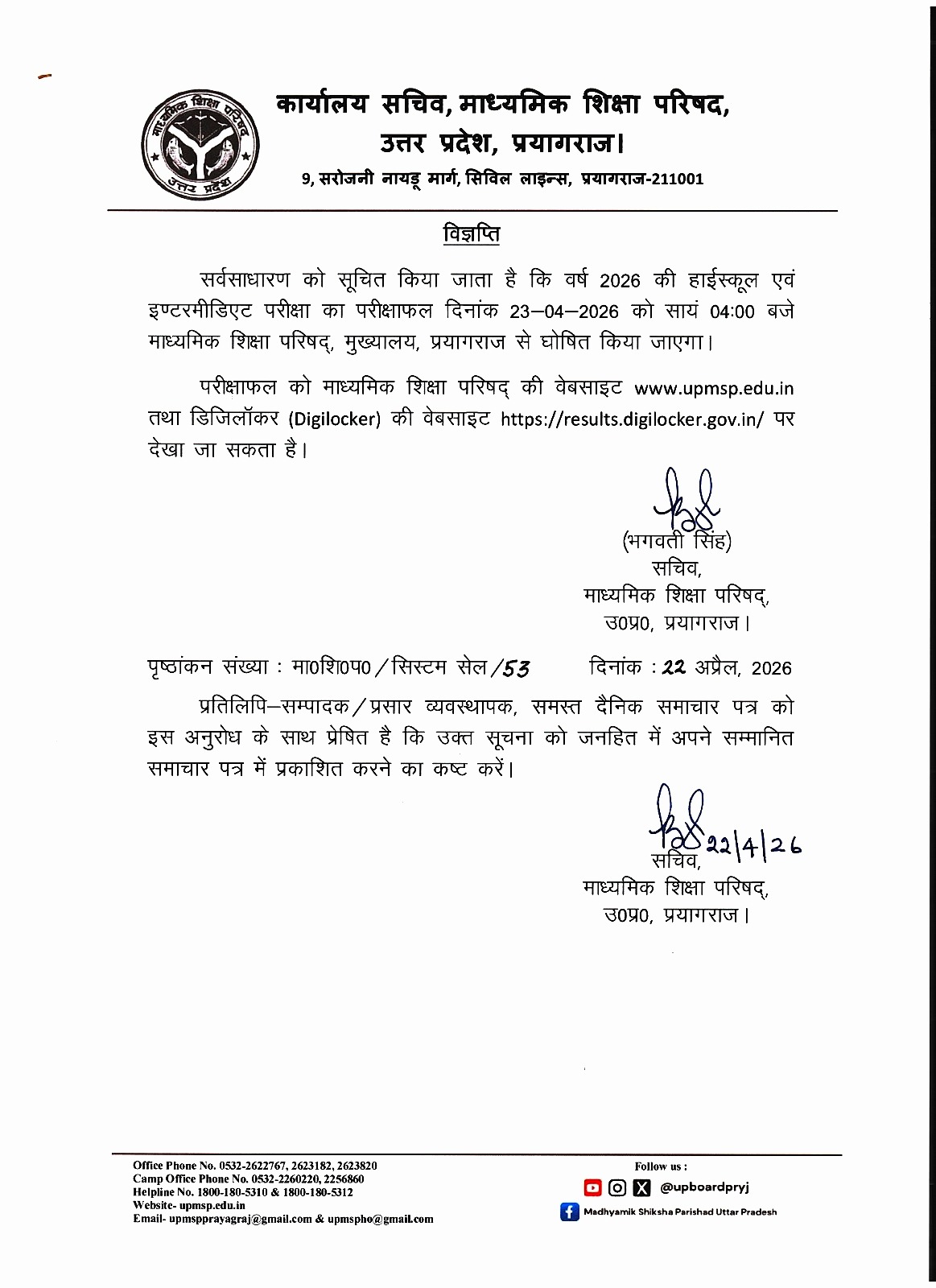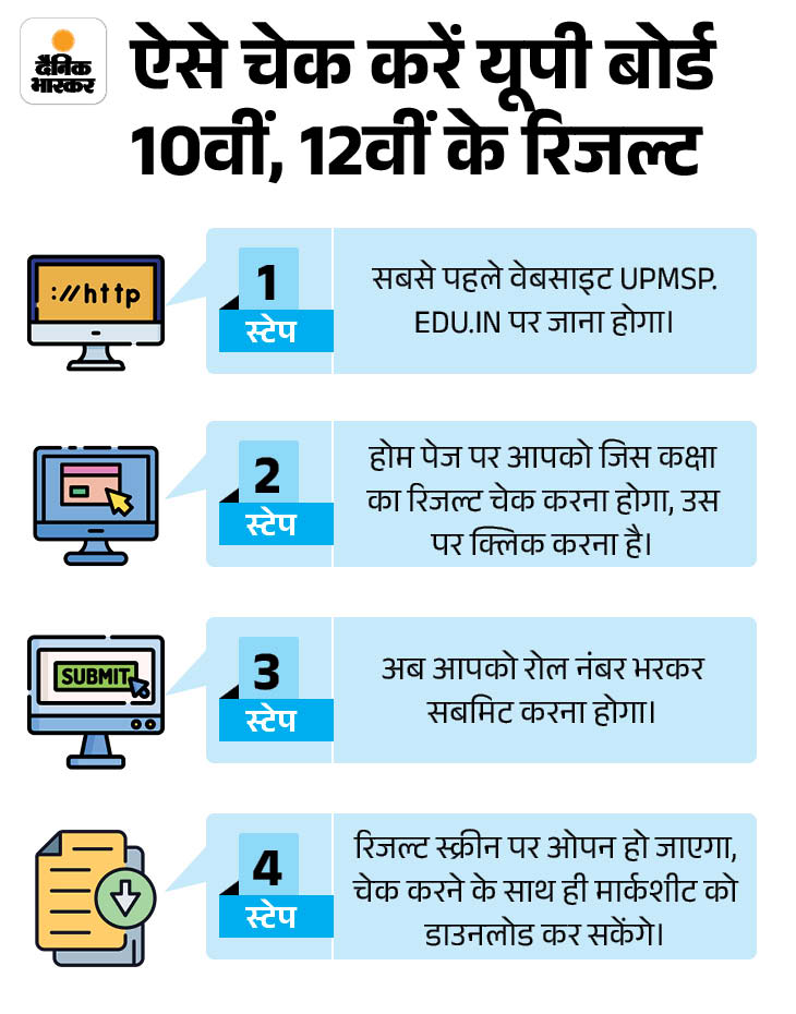 यूपी बोर्ड की 10वीं और 12वीं कक्षा का रिजल्ट कल यानी 23 अप्रैल को जारी होगा। छात्र ऑफिशियल वेबसाइट पर जाकर अपना रिजल्ट देख सकते हैं। यूपी बोर्ड के सचिव भगवती सिंह ने बताया कि गुरुवार शाम 4 बजे रिजल्ट जारी किया जाएगा। पिछले साल 25 अप्रैल को परीक्षा पर